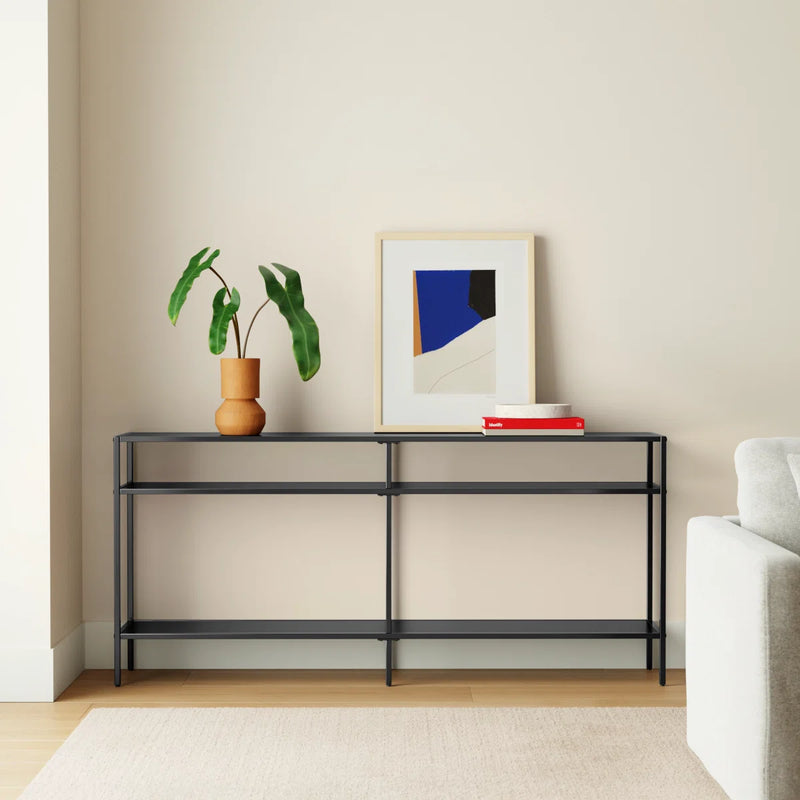 Recomendación: úsalo bajo un espejo, junto a un sillón o como mueble de transición en pasillos largos. Su estructura liviana permite destacar los objetos que exhibe sin competir con ellos.
