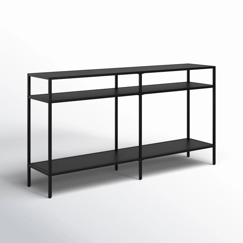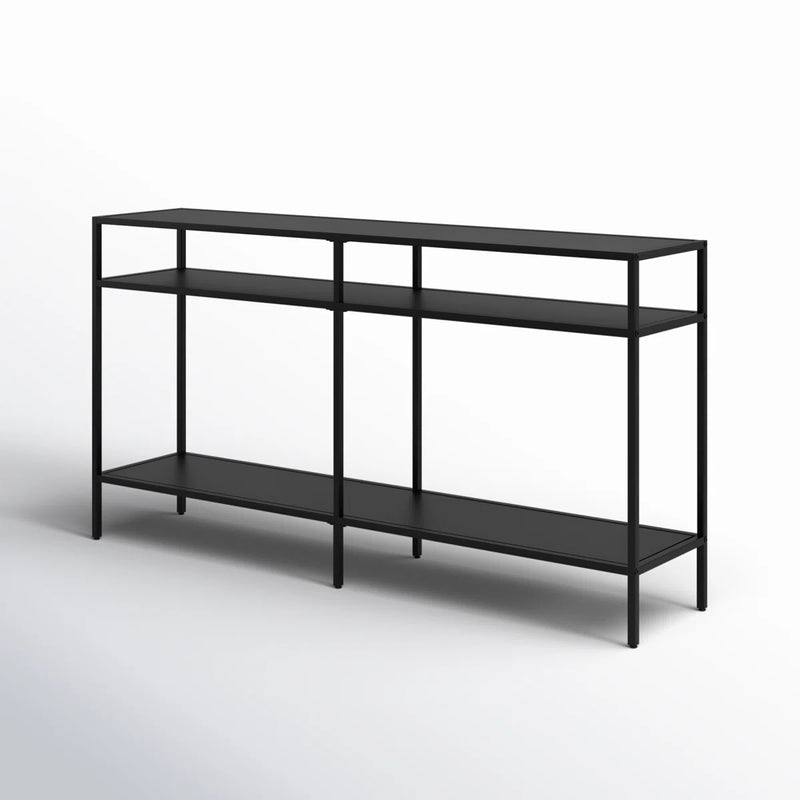 Incorpora tres niveles de repisas en acero laminado, lo que permite organizar libros, objetos decorativos, lámparas o plantas sin sobrecargar el ambiente. Su diseño abierto y simétrico mantiene proporciones equilibradas, creando una presencia versátil y elegante.
