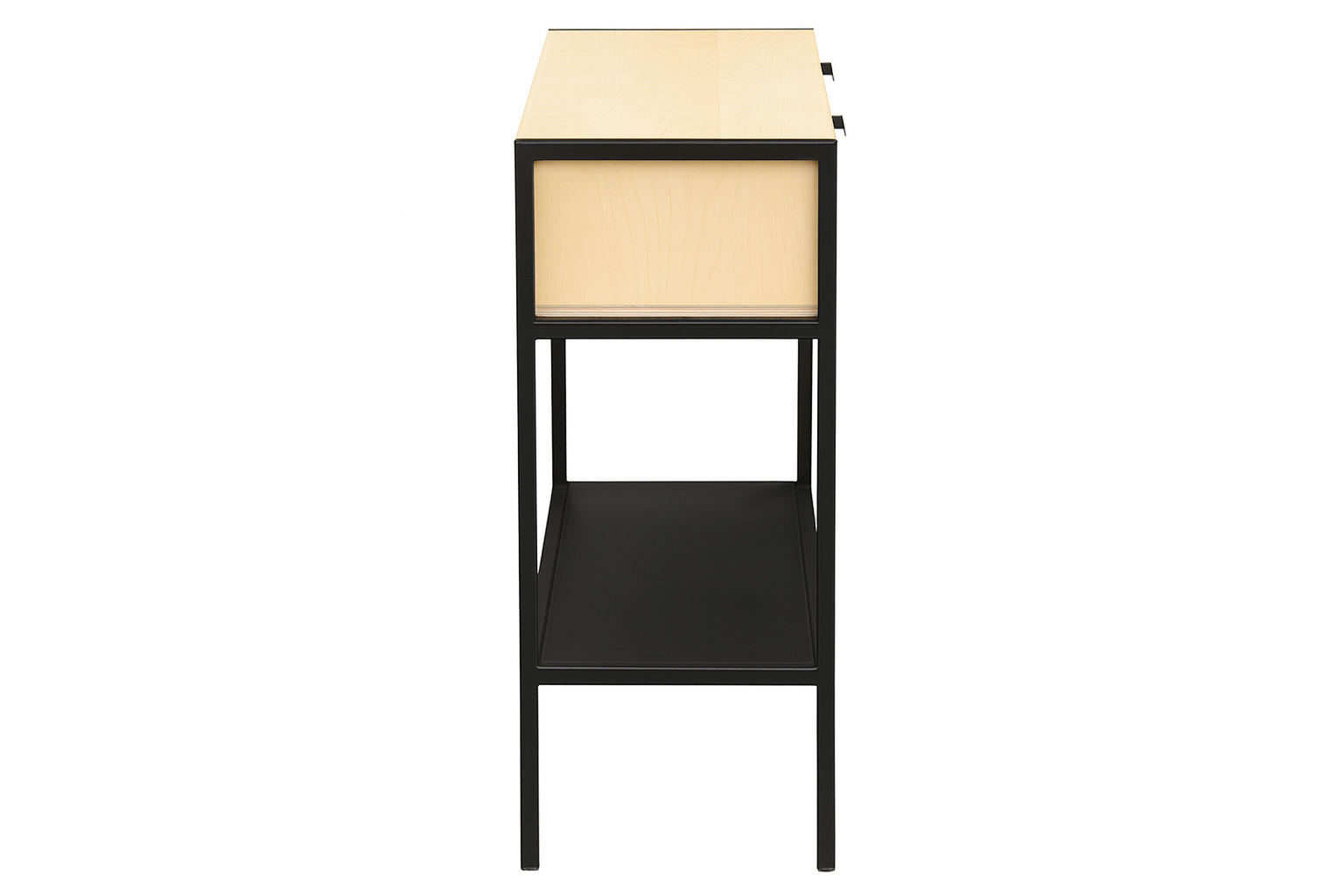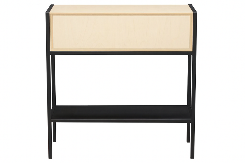 El Arrimo ARTHUS equilibra la calidez natural de la madera con la precisión geométrica del metal. Su estructura de acero negro sostiene un módulo en plywood de abedul de 15 mm con cantos expuestos, donde cada capa del abedul revela la honestidad del material.