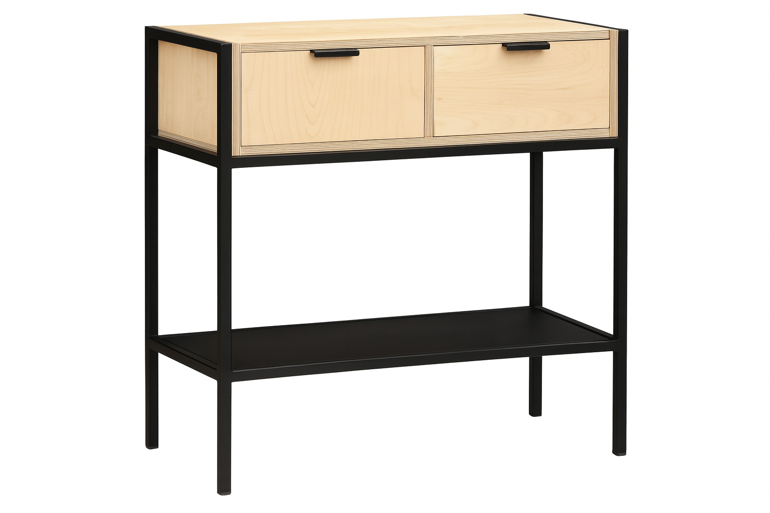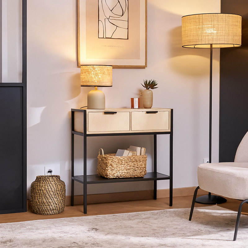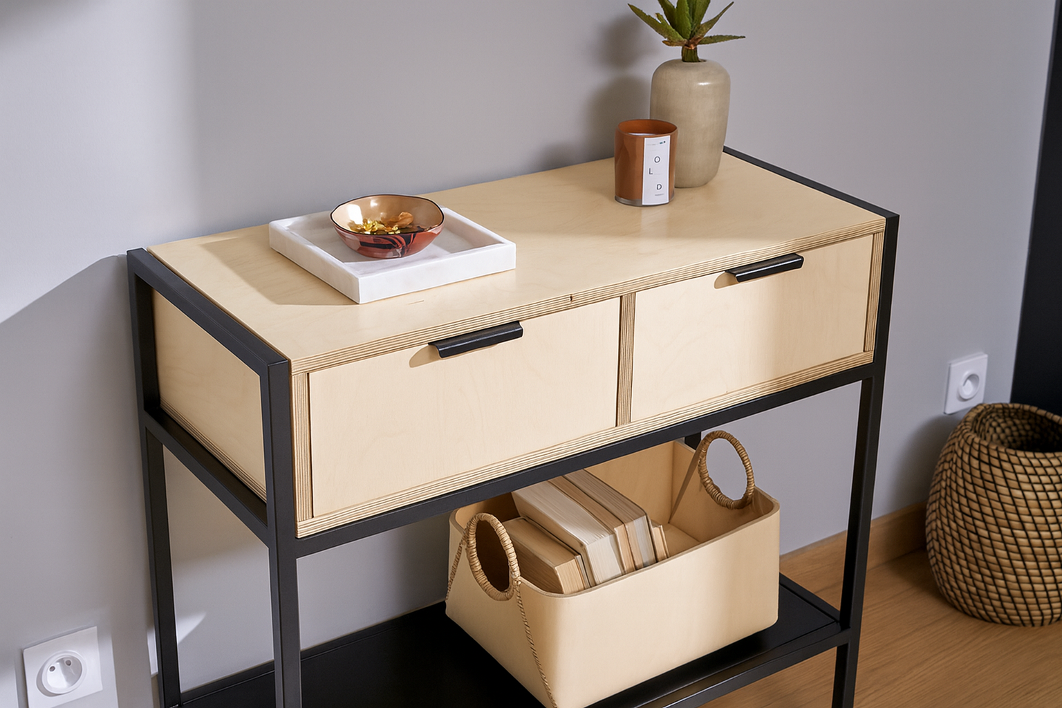 Los dos cajones ofrecen un espacio funcional para mantener el orden en la entrada o el living, mientras la repisa inferior amplía las posibilidades de uso y exhibición. Su formato compacto la hace ideal para espacios reducidos, sin renunciar al carácter y presencia del mobiliario Kallfu.