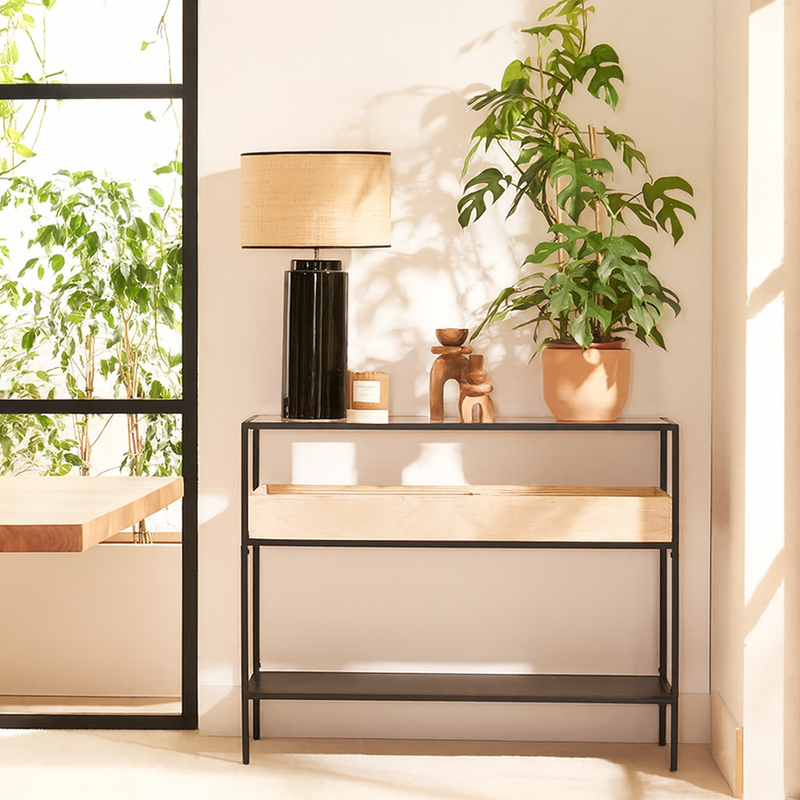 Fabricado con un diseño liviano y minimalista, es ideal para entradas, pasillos o livings donde se busca presencia sin saturación visual. La acacia, trabajada artesanalmente, destaca por su veta única y tonos naturales, logrando un contraste perfecto con el metal negro.