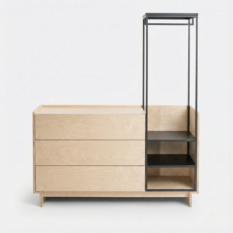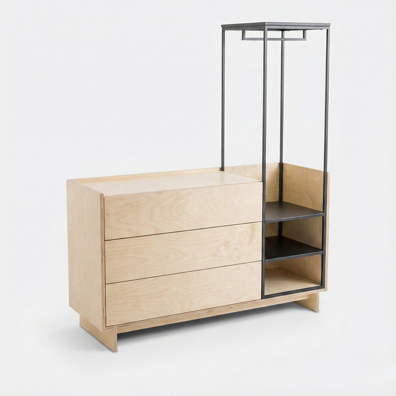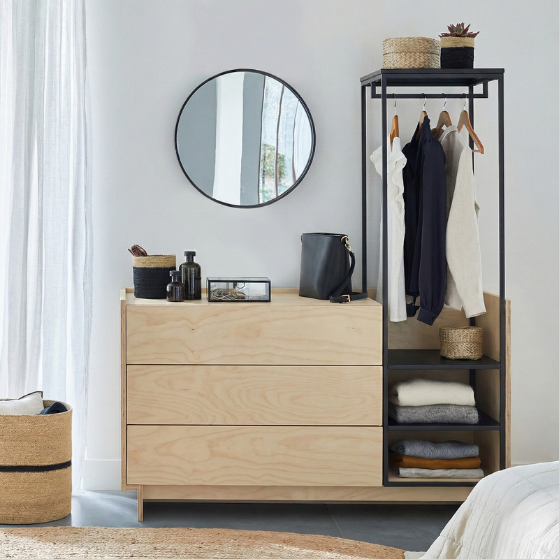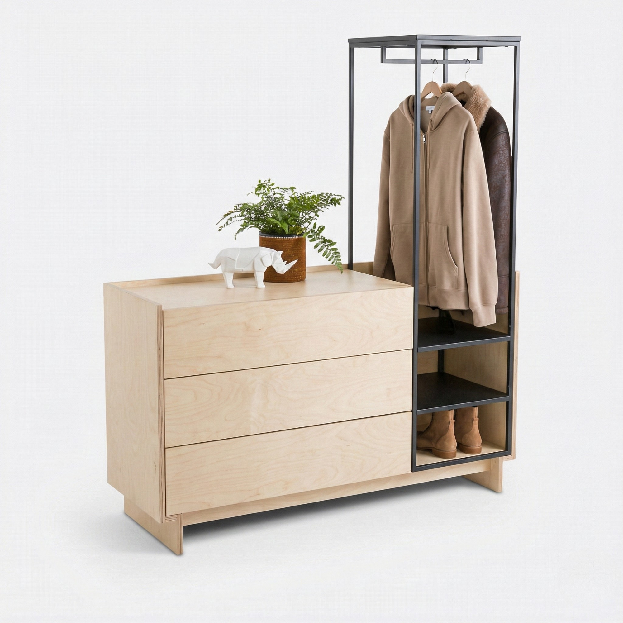 Precio de ofertaEl Dresser & Closet Denho es una solución completa de organización, diseñada para maximizar el espacio con estética minimalista y materiales de alto estándar. Combina tres amplios cajones en madera natural con una estructura vertical en acero negro que integra colgador y repisas, permitiendo guardar ropa, accesorios y piezas de uso diario en un solo lugar.