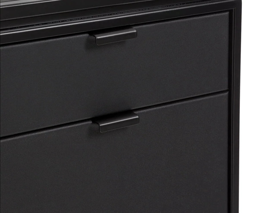• Estructura, patas y tiradores de metal negro mate, acabado electropintado