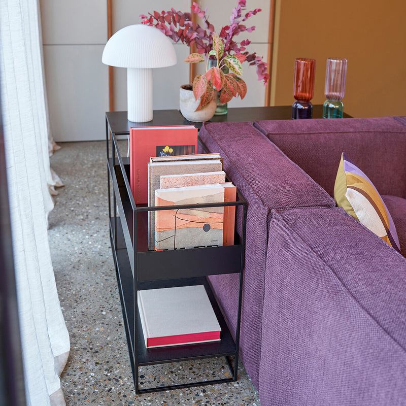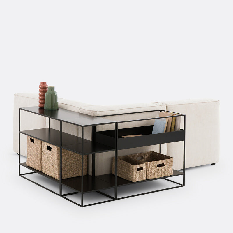 Su formato versátil permite usarlo como estante tras sofá, consola o mueble auxiliar, adaptándose a diferentes ambientes del living o dormitorio.