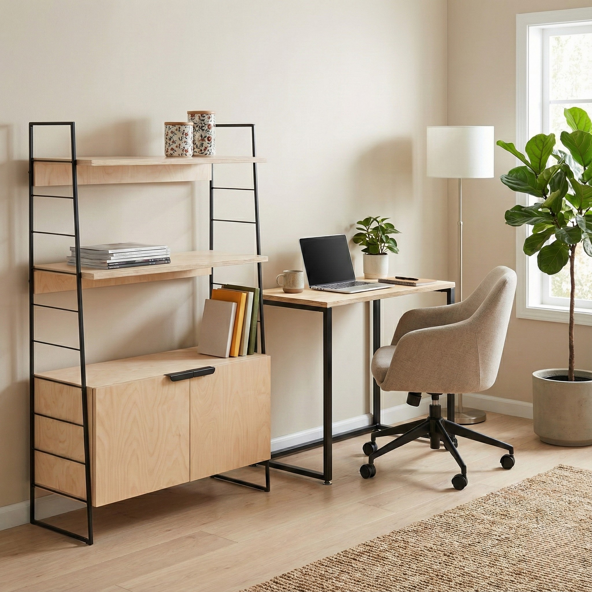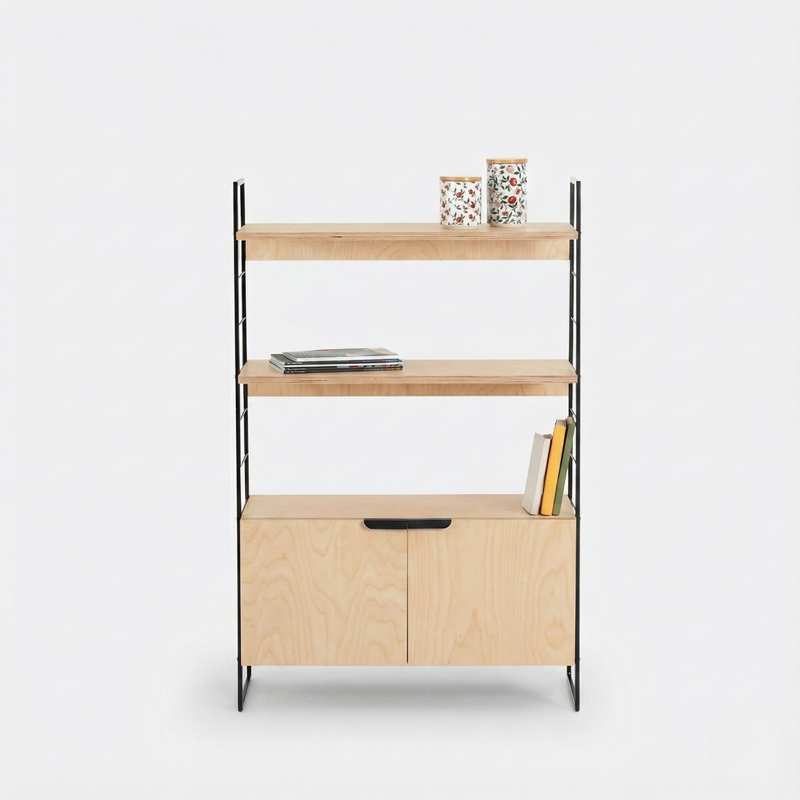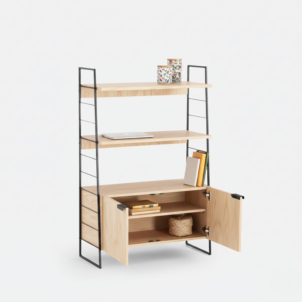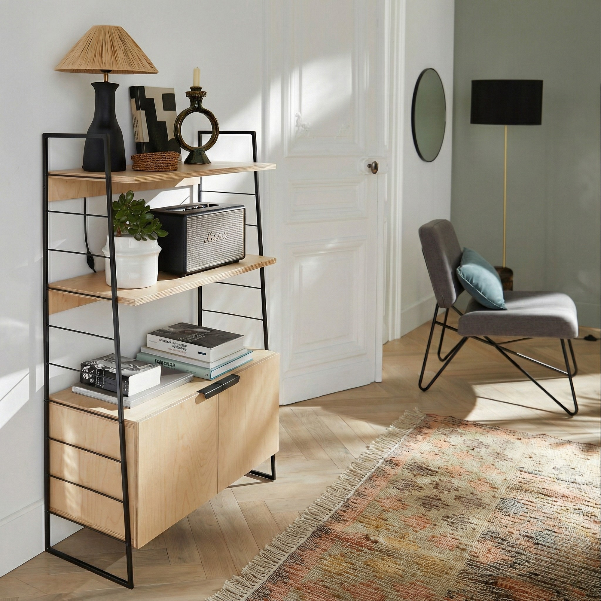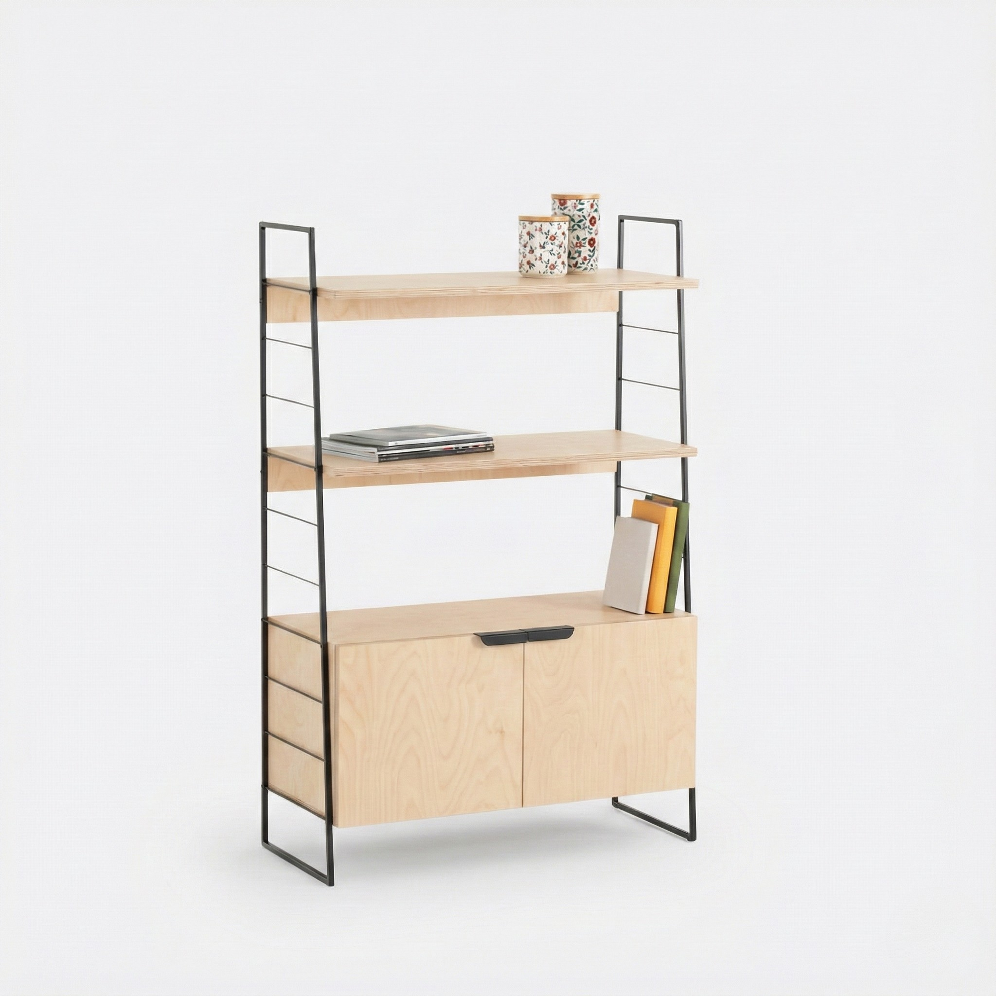 Precio de ofertaLa Estantería WATFORD combina acero negro y Plywood de abedul para lograr un diseño limpio, moderno y cálido, ideal para living, home office o espacios creativos. Su composición asimétrica une ligereza visual con gran capacidad de almacenamiento, integrando dos repisas amplias y un módulo cerrado perfecto para mantener ordenado lo esencial.