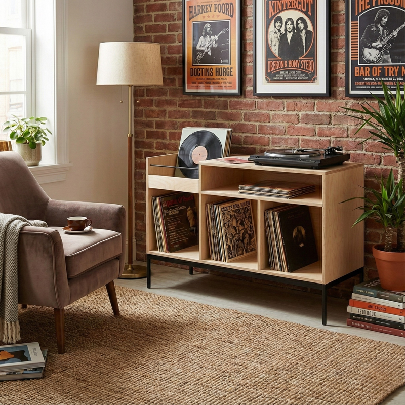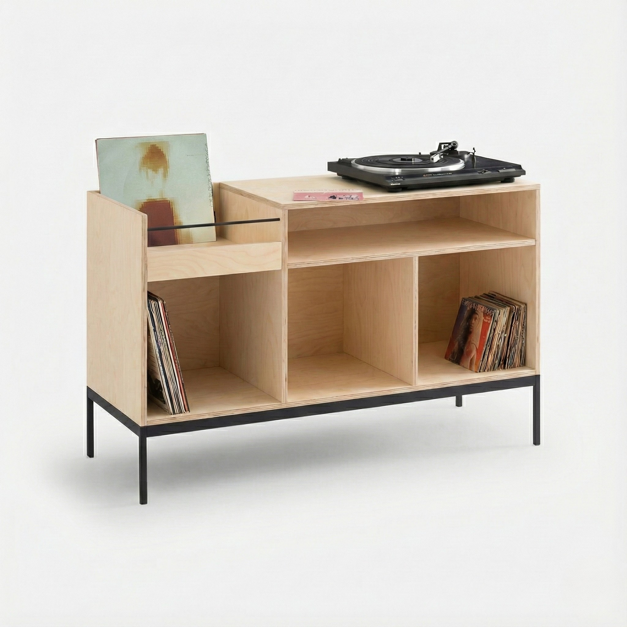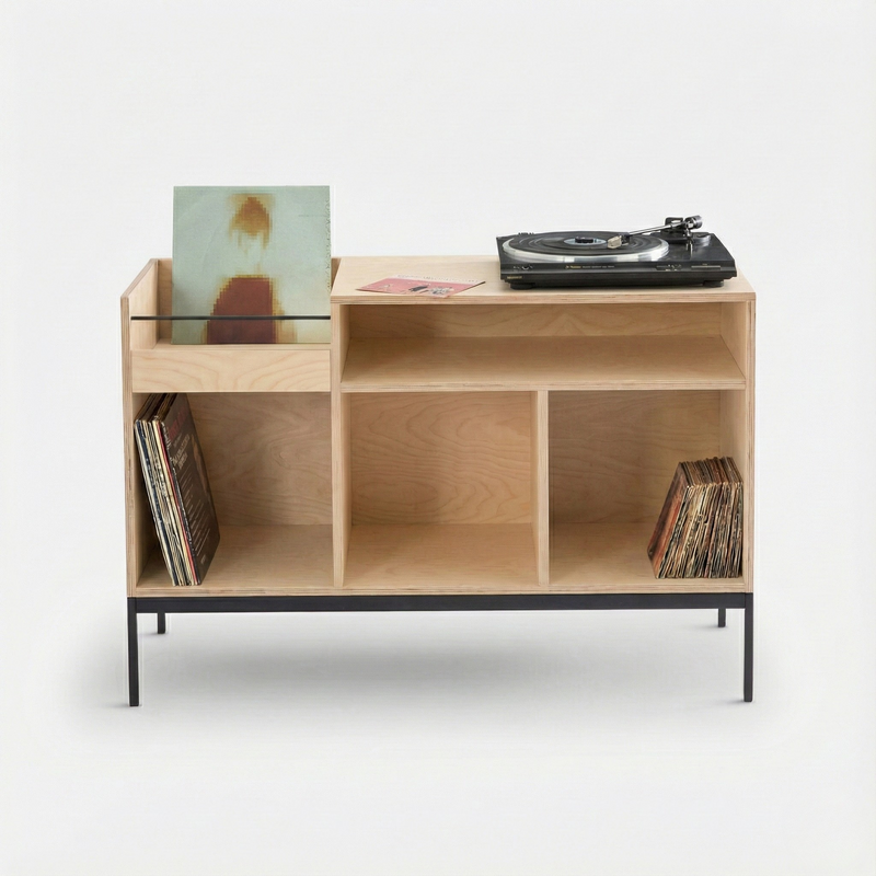 incluye un casillero de selección para los vinilos del momento, una superficie amplia para tu tornamesa o equipo, y tres compartimentos inferiores que permiten almacenar una colección completa, libros u objetos decorativos.