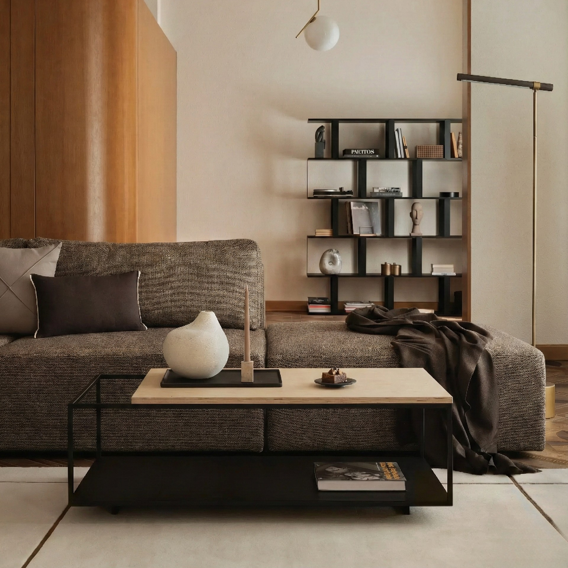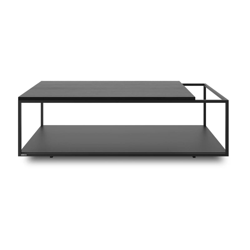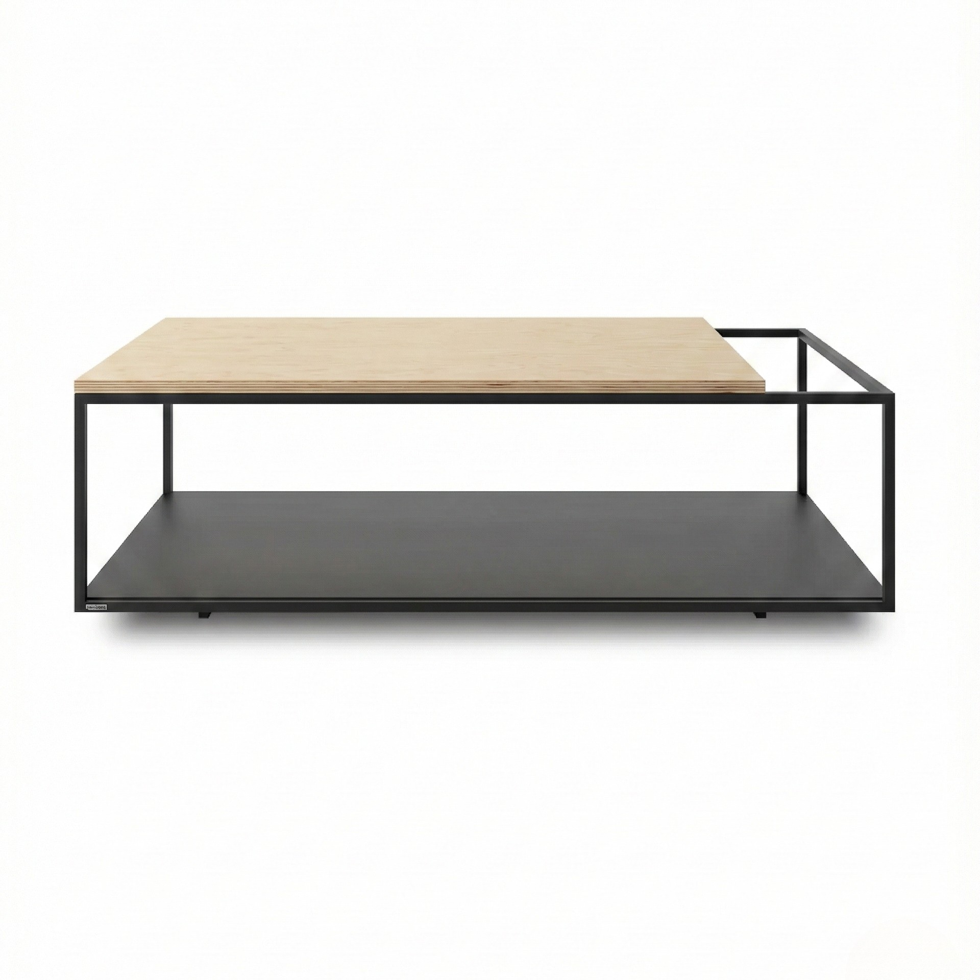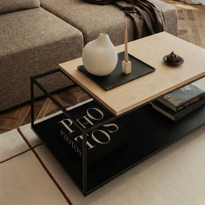 La combinación entre acero negro de líneas delgadas y una cubierta de madera natural genera un equilibrio preciso entre solidez y ligereza visual. El nivel inferior metálico funciona como superficie de apoyo adicional, ideal para libros, revistas u objetos decorativos, manteniendo el orden sin restar protagonismo al diseño.