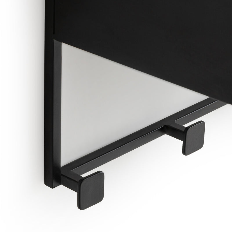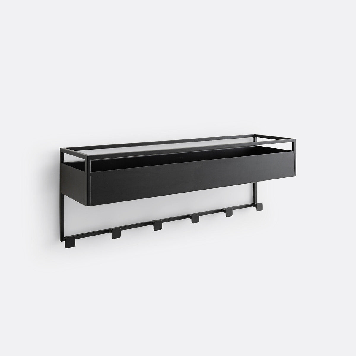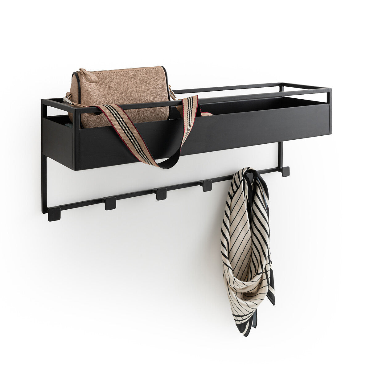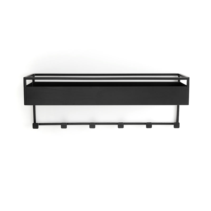 Su diseño geométrico permite almacenar objetos pequeños en la parte superior, mientras sus 6 ganchos inferiores ofrecen espacio para colgar bolsos, bufandas o chaquetas, liberando superficie en tu living, entrada o dormitorio.