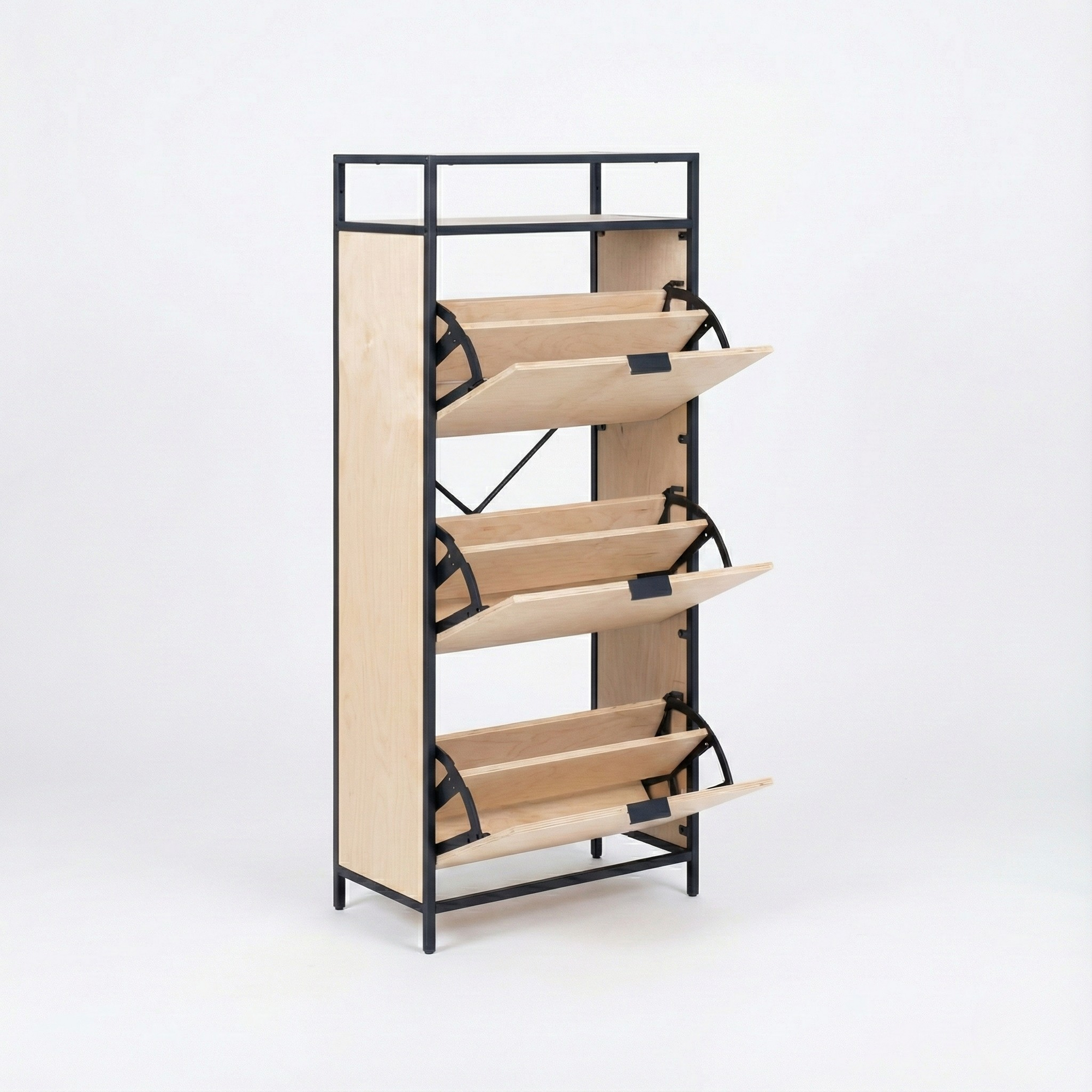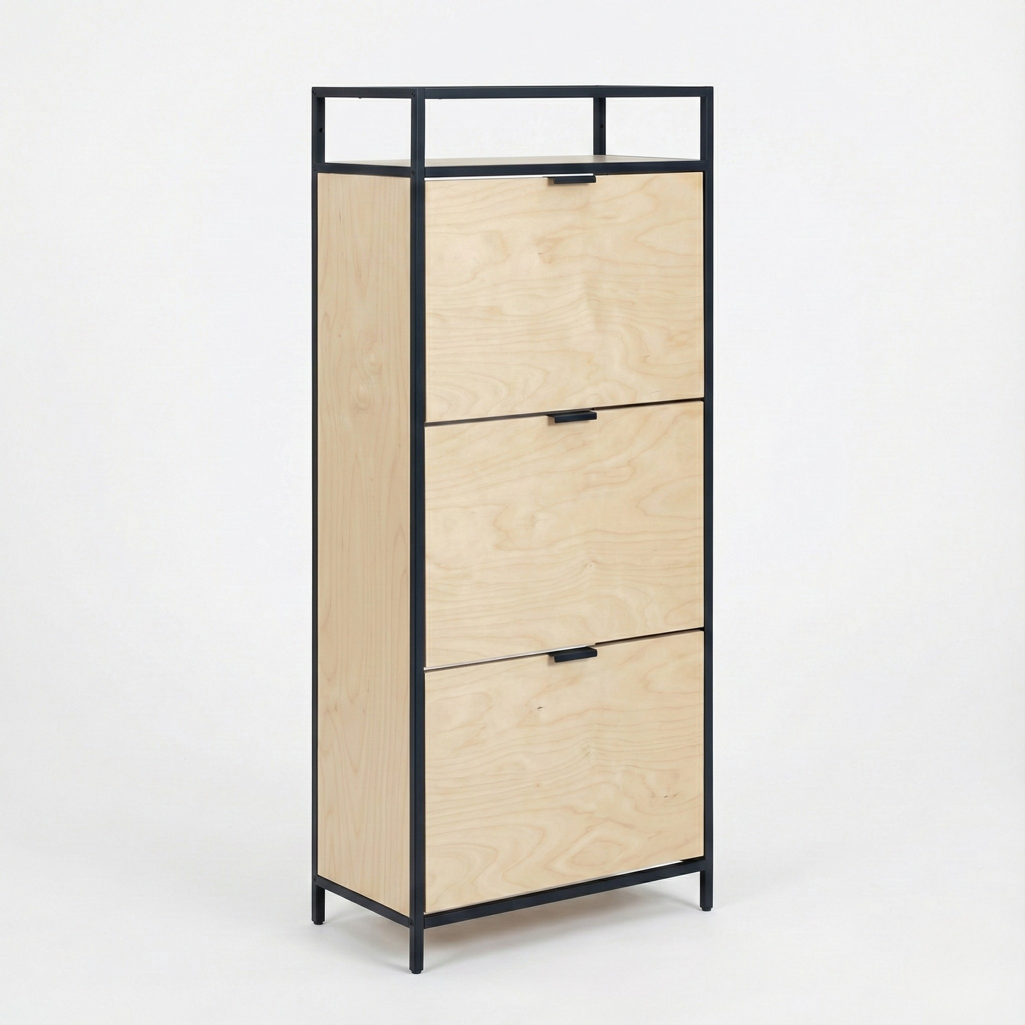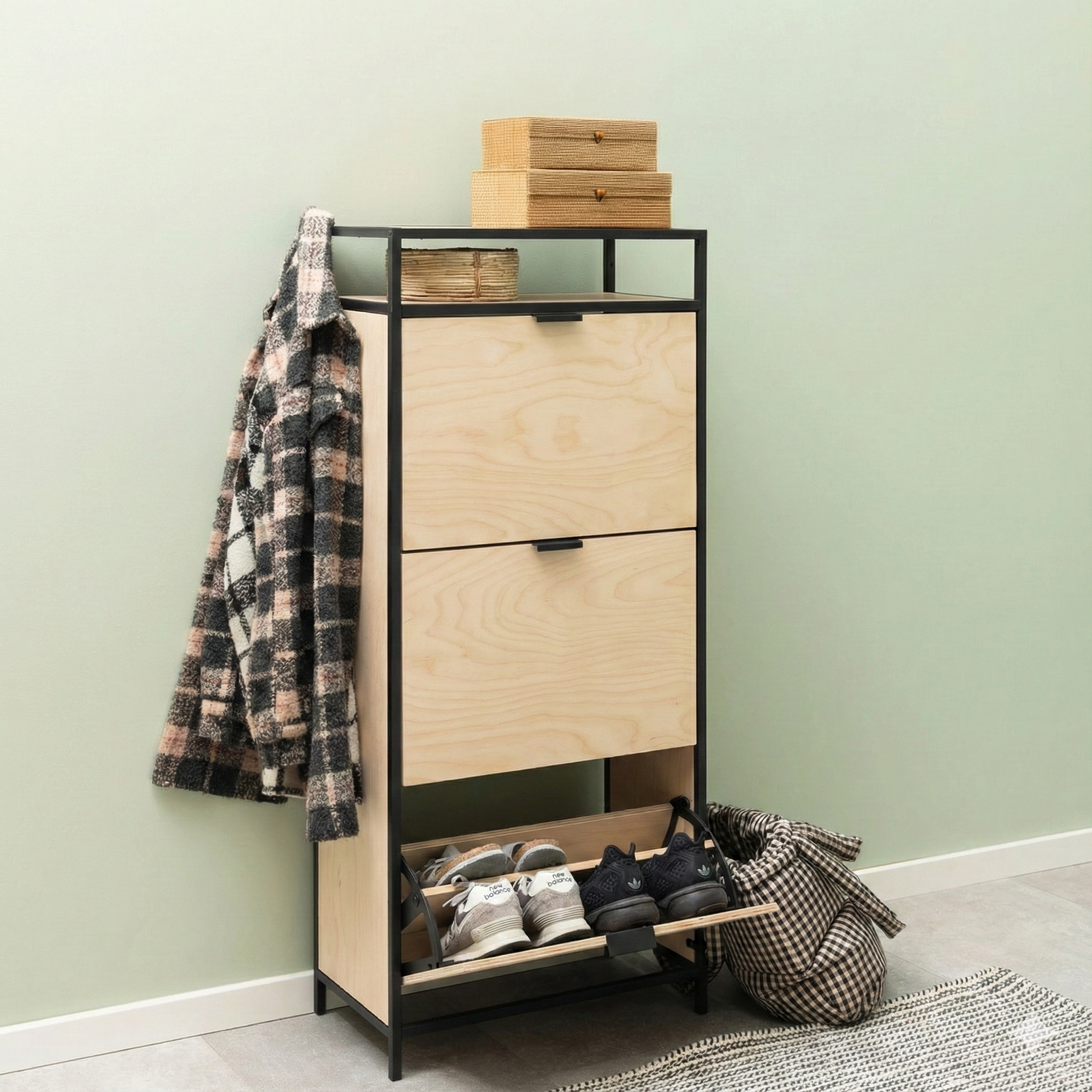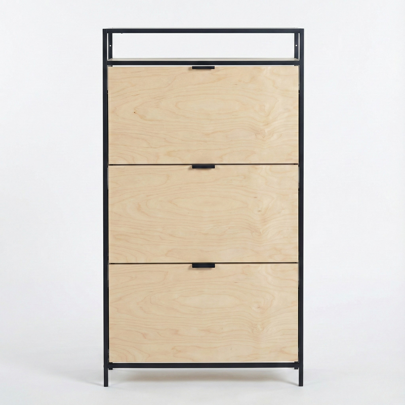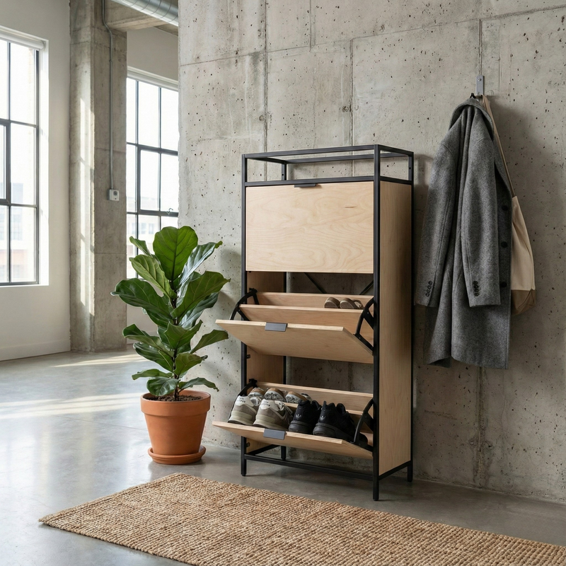 El Zapatero SEAFORD combina una estructura de acero Metal Black con frentes de madera en tonos naturales, creando una pieza moderna, robusta y pensada para maximizar el espacio sin sacrificar estilo.